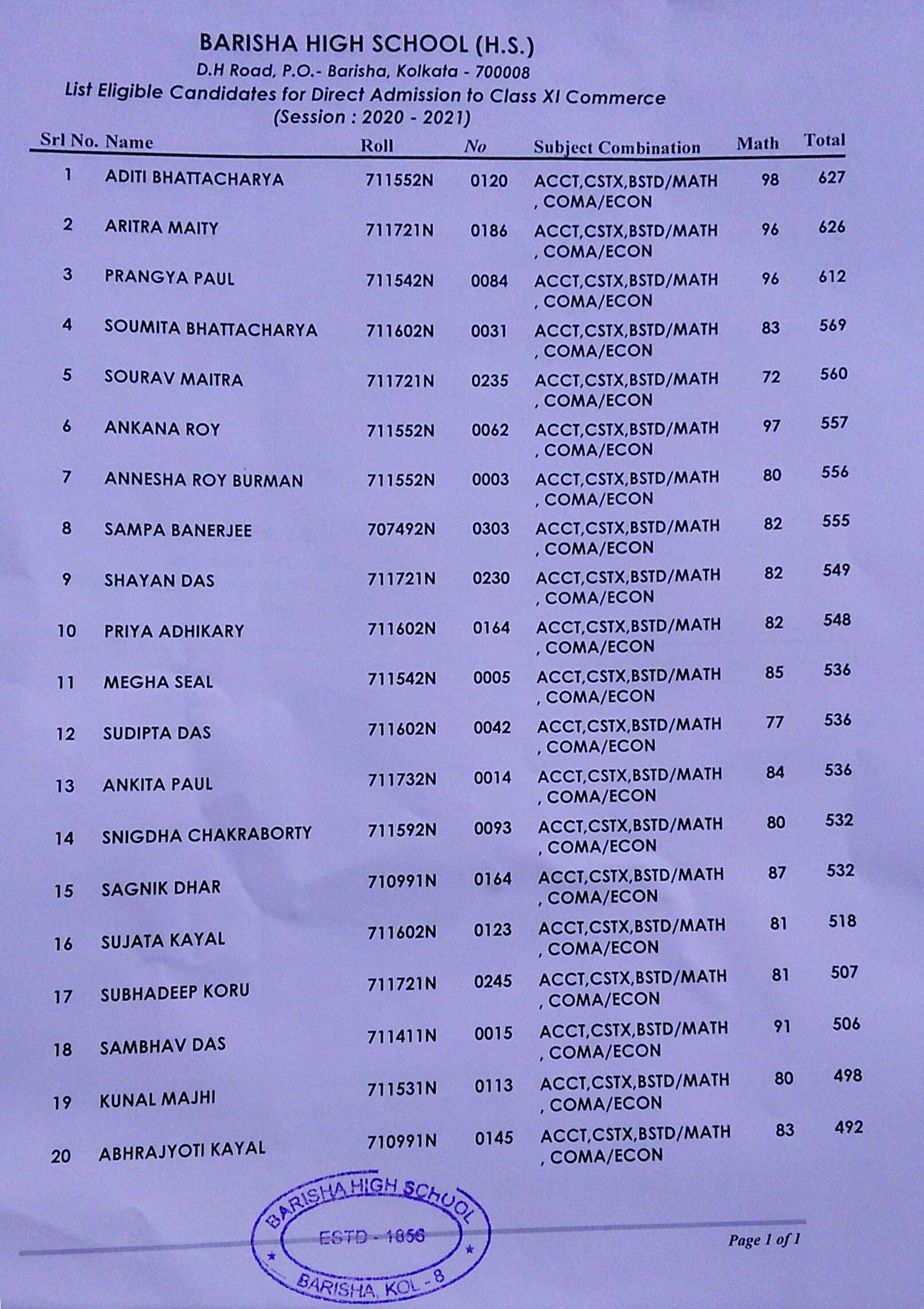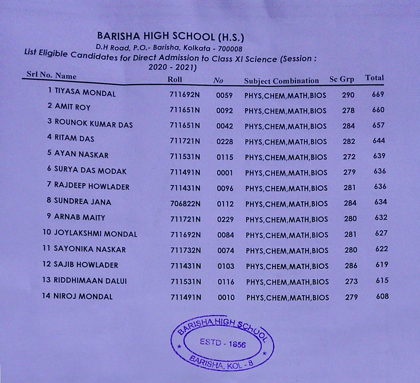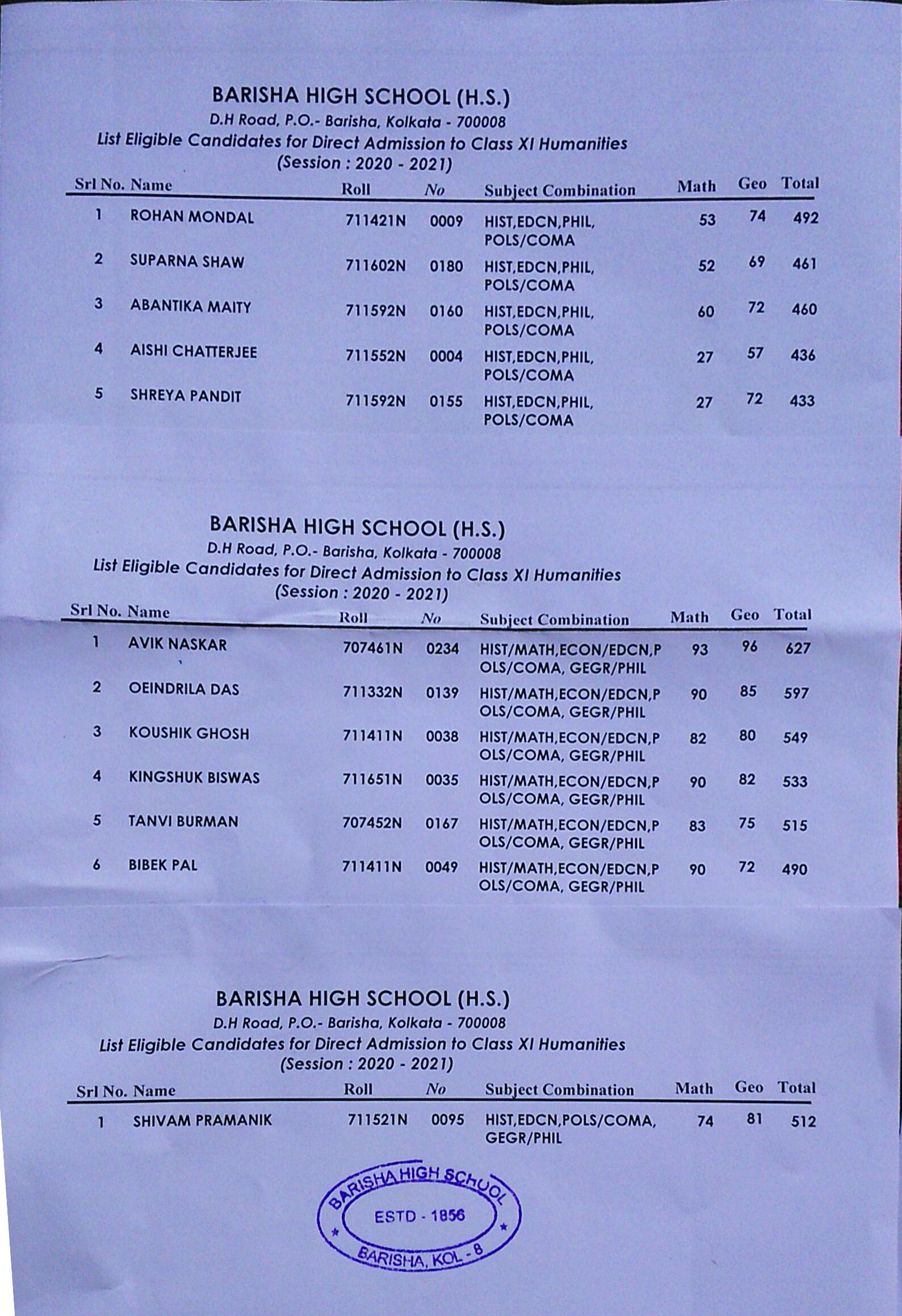 Parents of the selected candidates are requested to come to Barisha High School for completion of the admission procedure on 12/08/2020 at 11:30 AM. They must bring original Marksheet of Madhyamik Pariksha(SE) – 2020, two passport size colour photos, original Aadhaar Card, Caste certificate (for candidates belonging to SC, ST, OBC) of the candidates and original Aadhaar Card of parents and Rs. 280/- following COVID-19 protocols.